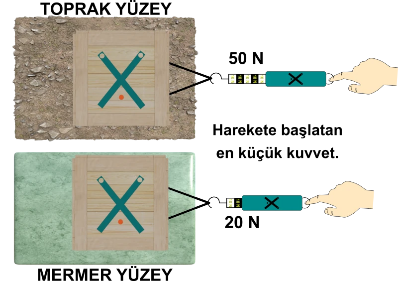 Görselde özdeş kutular, özdeş dinamometrelerle, farklı yüzeylerde her bölmesi 10 N ölçen bir dinamometre ile çekiliyor ve ilk defa harekete başladıkları anda dinamometrenin gösterdiği değer okunuyor. Bu değer kutuya uygulanan sürtünme kuvvetinin ölçüsüdür.