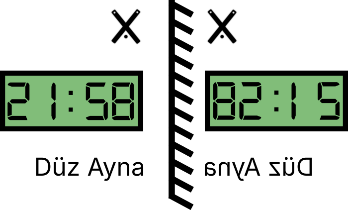 Deney: Bir düz aynaya bakarak sağ elinizi kaldırın. Görüntünüzün sol elini kaldırdığını göreceksiniz. Bu, düz aynada görüntünün simetrik olduğunu gösterir. Başınızın yukarıda olması ise görüntünün düz olduğunu gösterir. Ters görüntü ile kast edilen baş aşağı görüntüdür.