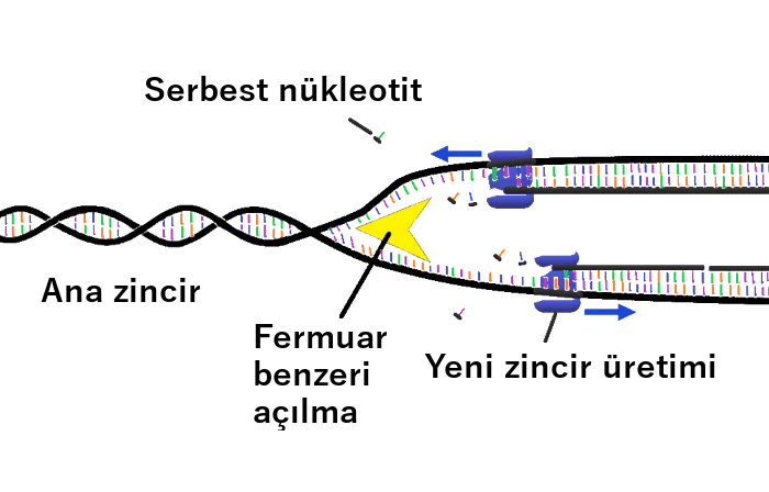 DNA kendisini eşlemek için tıpkı bir fermuar gibi açılır ve her bir kol farklı birer DNA zincirine referans olur. Sonuç olarak bir DNA zinciri doğrudan iki yeni zincirin yarısını oluşturacak şekilde yeni birer DNA zinciri elde edilir.
