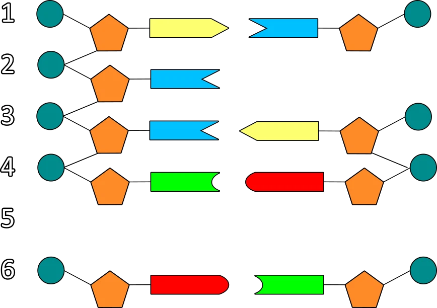Aşağıdaki görselde 2. ve 5. bölümlerde hata görüyorsunuz. 2 nolu bölümün karşısına anahtar – kilit ilişkisine uygun parça gelir ve düzeltilir ancak 5 nolu bölümdeki hatayı düzeltecek bir referans nükleotit bulunmamaktadır. Bu tür durumlarda kişi kanserli bir hücreye sahip olur ve savunma sistemi bu hücreyi bulup parçalar. Eğer hücre parçalanmaya karşı dirençliyse kanser gelişir.