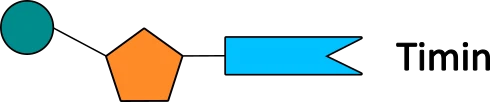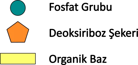 Her bir nükleotit; fosfat grubu, deoksiriboz şekeri ve adenin, timin, guanin ya da sitozin organik bazlarından birisinin birleşimi ile oluşur.
