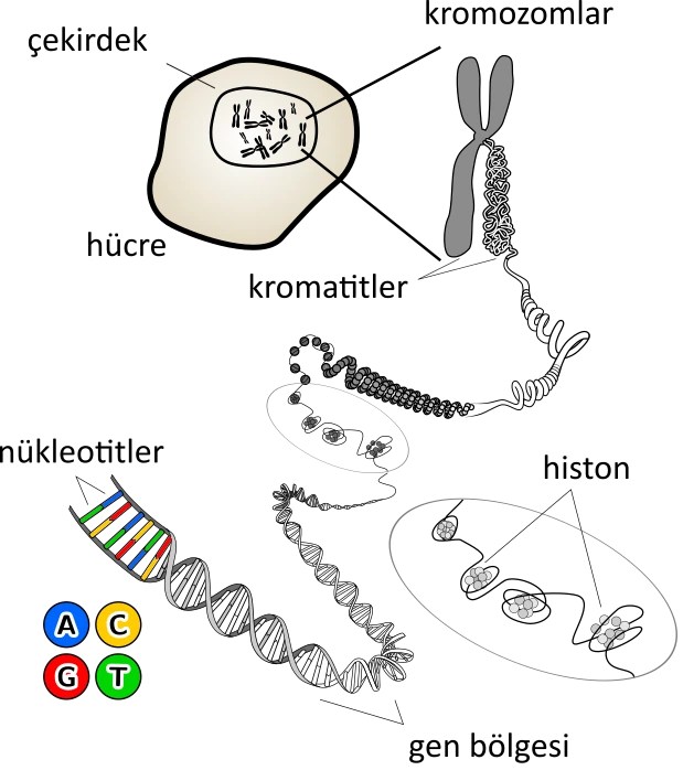 Hücre çekirdeğinde bulunan kromozomları oluşturur ve düzenler: DNA, kromozomların yapısını ve organizasyonunu oluşturur. Kromozomlar, DNA’nın yoğunlaştırılmış ve düzenlenmiş hali olarak işlev görür.