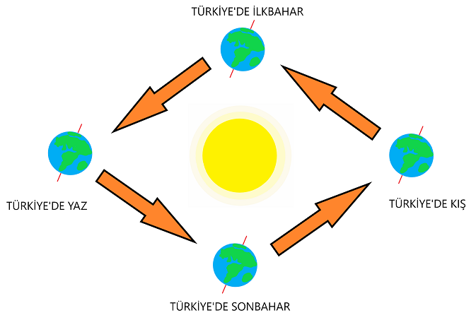 Dünya’nın Güneş etrafında dolanması ve kendi etrafında dönme ekseninin eğikliği sonucu mevsimler oluşur.