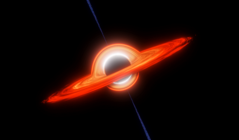 Astrofizik jetler genellikle kara deliklerin kutuplarına dik biçimde uzanan hiper radyoaktif uzantılardır. Işık hızına yakın hızlarda hareket eden küçük parçacıklar karadeliğin merkezine doğru hareket ederken x-ray ışıması yapar ve bu görüntü oluşur. Bir kara delik jeti güneşten altmış bin kat daha sıcaktır. Jet ışımasını doğru biçimde çizebilmek için Hubble Teleskobu’nun M87’ye ait astrofizik jetinden elde ettiği bu görüntü kullanılarak görsele benzeri yerleştirilmiştir ve Görsel 6’da gözlemleyebileceğiniz kutuplara bağlı mor-mavi renkte ışınımlar görselleştirilmiştir.