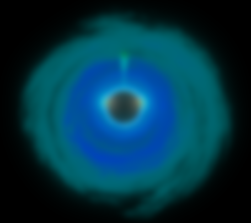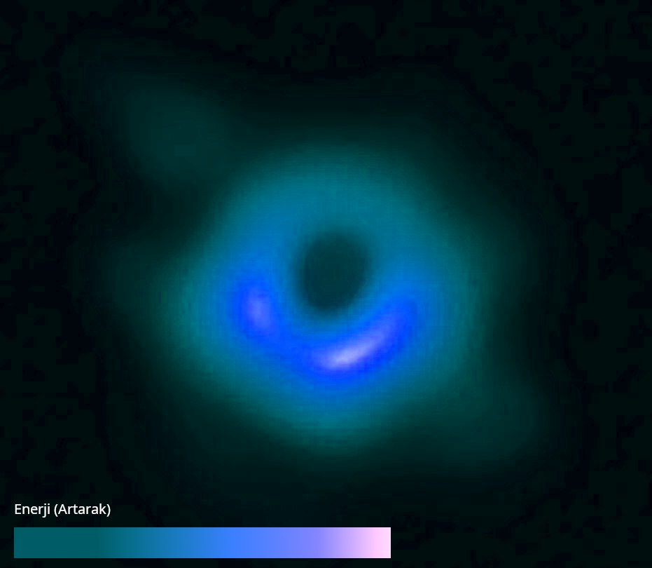 Bu resimde kara deliğin en yüksek enerjiye sahip kısmının beyaz, orta seviye enerjiye sahip kısmının mavi ve en düşük enerjiye sahip kısmının turkuaz renkte işaretlendiği görülmektedir.