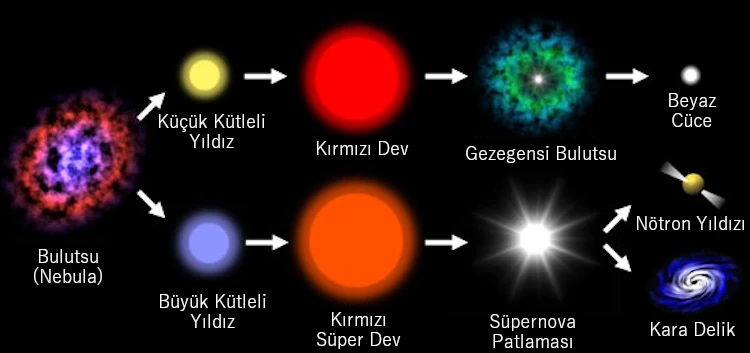 Yıldızlar kütlelerine göre farklı bir yaşam döngüsüne girebilirler. Bunun diyagramını aşağıda sizler için hazırladık.